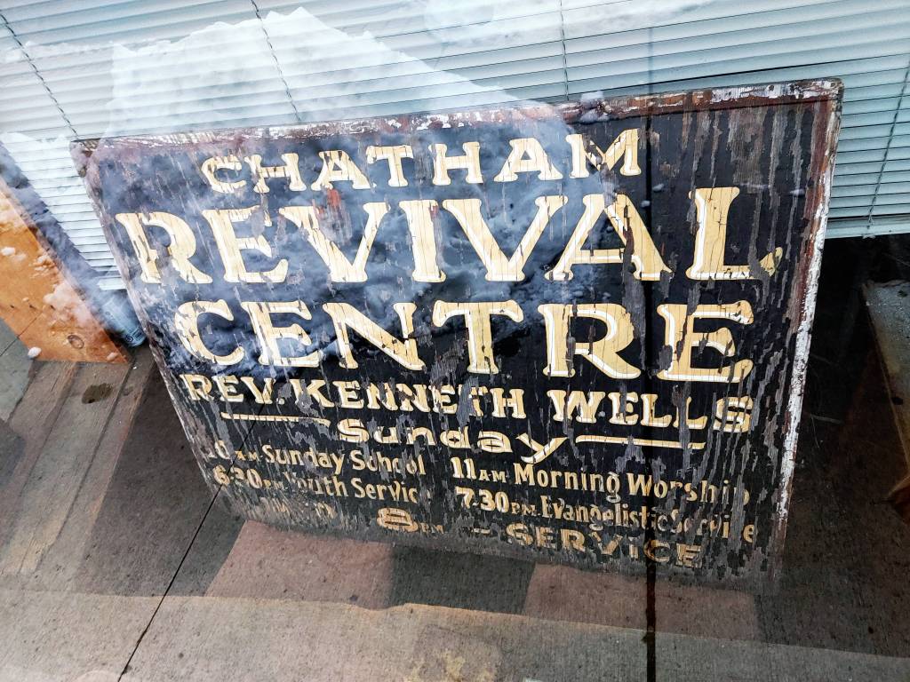 In the window there is an old and weathered sign announcing the weekly meetings of the Chatham Revival Centre in Chatham, Ontario pastored by Rev. Kenneth Wells. He was “called home”, as is the expression, in February 2021.