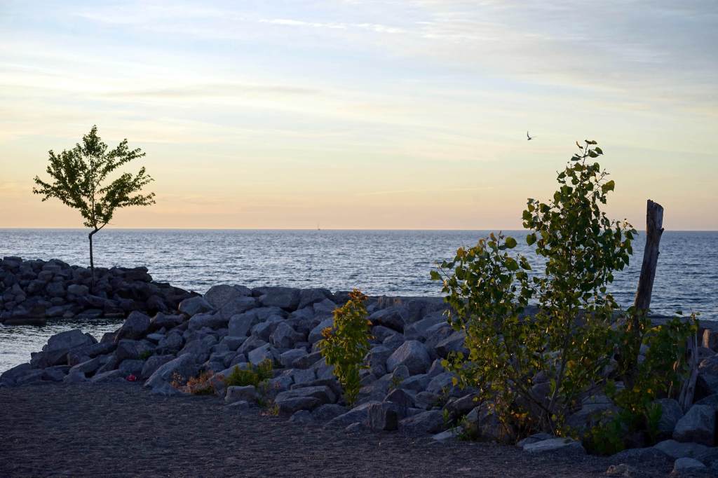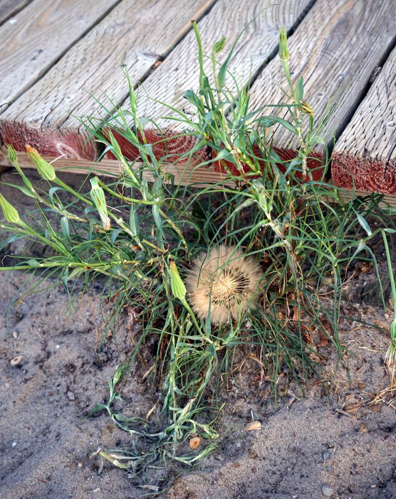 Nothing like dumping a sand dune out of one’s shoes after a lovely stroll at The Beach in east Toronto. Chilly morning! Wearing gloves briefly crossed my mind. Stanchions of resilience against the elements in the Leuty Lifeguard Station and the Lonely Little Tree (is that a Silver Maple?) watch over the sandy shore. I see the Little Tree has some company. Temporary impressions of avian exploration dint the sand. Salisfy seed ball at the edge of the boardwalk ready for distribution. Where did I hide that acorn?